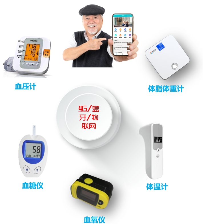 1)血壓計、血氧計、血糖儀、體脂秤、體溫計.....;2)健康數據查看;3)一鍵呼叫養老服務中心;4)一鍵提交養老需求(生活幫助、訂餐、購物、助醫)。5)適合居家/社區養老上門監測和社區日間照料中心或養老驛站監測。