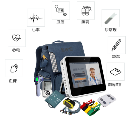 檢測內容:身高、體重、BMI、脂肪、血壓、血氧、體溫、便攜心電、腰臀比、打印機、血常規三項(血糖、總膽固醇、尿酸),血脂四項(總膽固醇、甘油三酯、高密度、低密度),數據自動上傳到平臺。